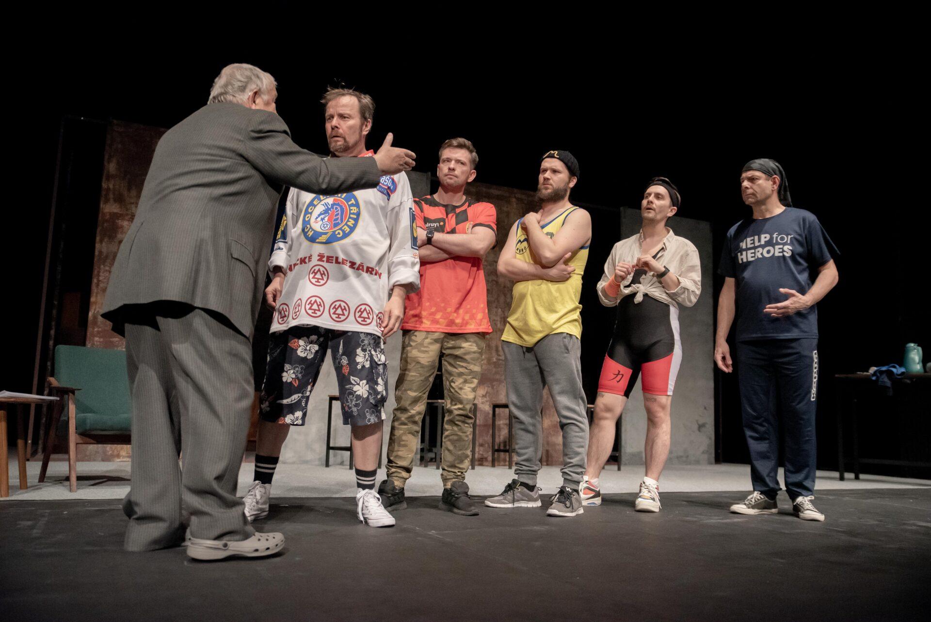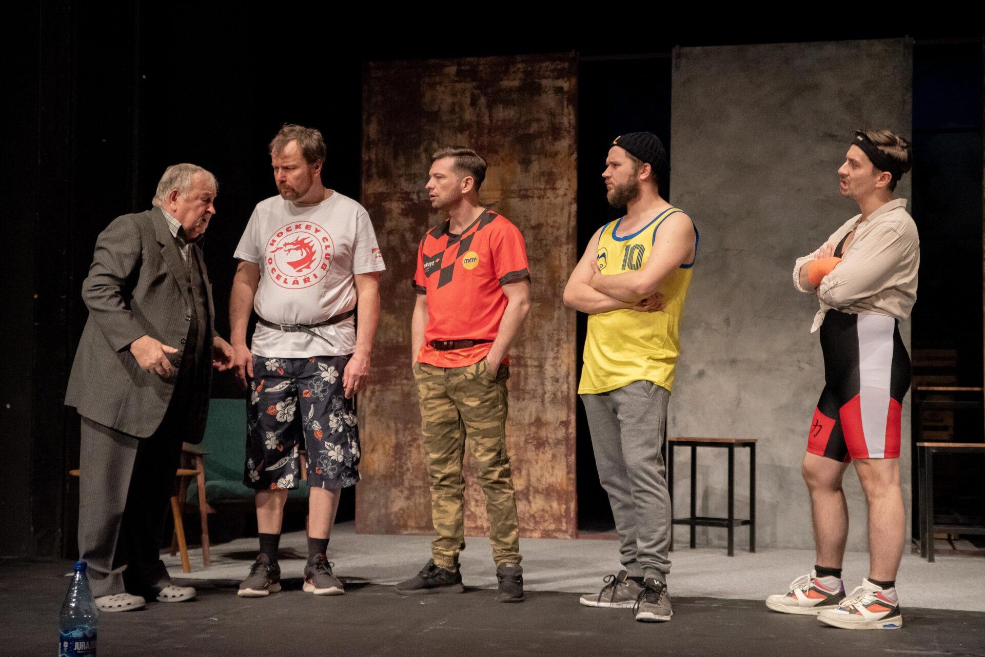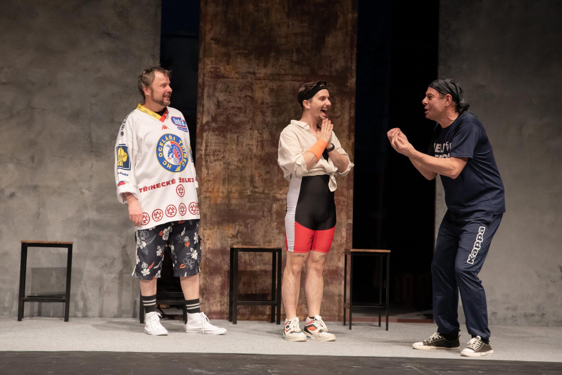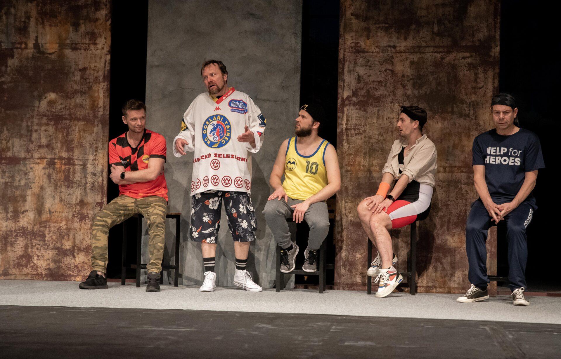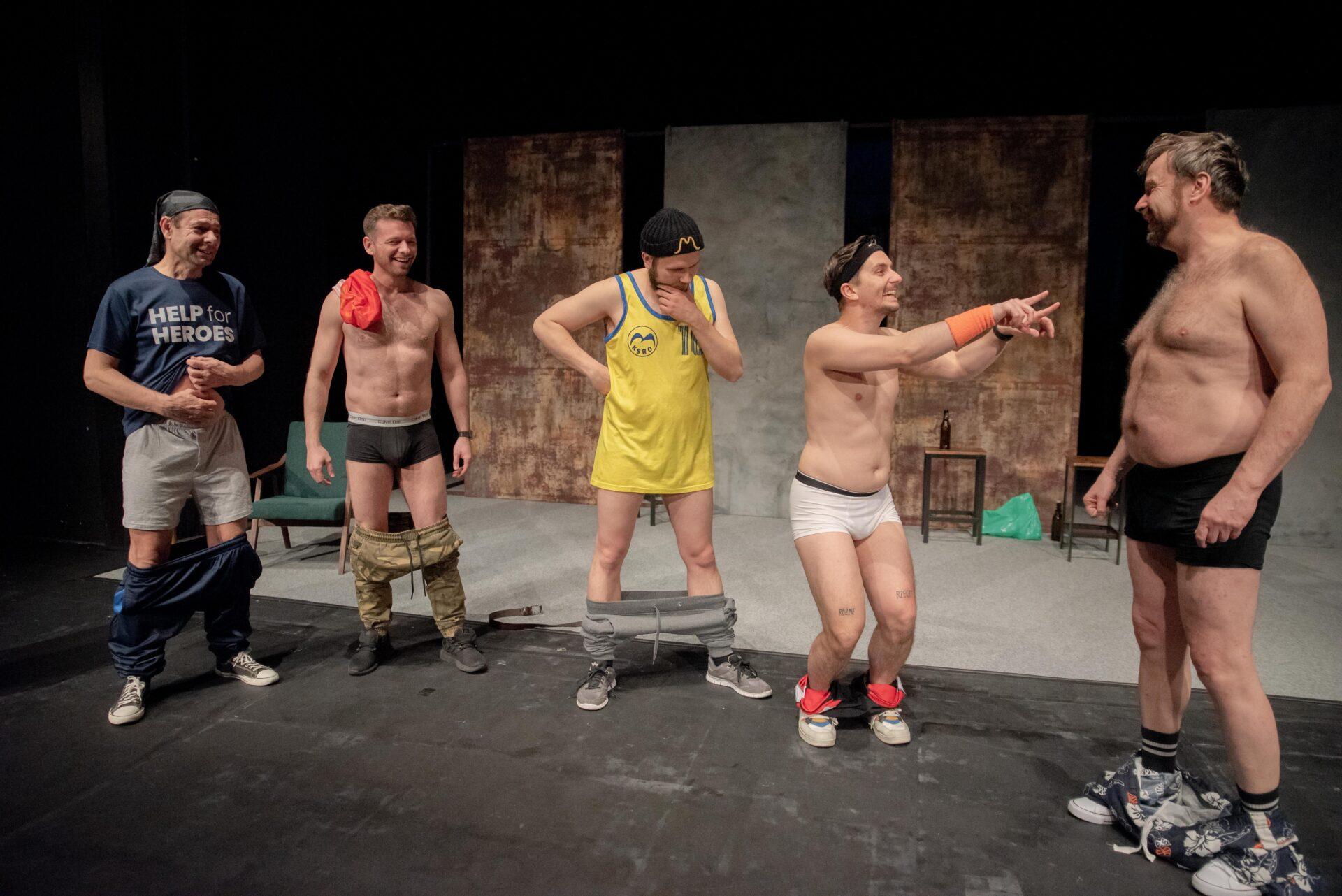 Hrdinové příběhu se snaží vyrovnat s nelehkou situací způsobenou ztrátou zaměstnání, která až nápadně připomíná aktuální krizi kolem hutě Liberty Ostrava ohrožující na 6000 zaměstnanců, situace se tak může týkat i některých z těšínských diváků, nebo jejich blízkých. Adam (Bogdan Kokotek) nadšeně investuje do pochybných podniků a potýká se s exekutory a věřiteli, kteří ho ohrožují na životě. Současně mu bývalá partnerka chce zakázat styky se synem, kterého sice (jak vyplývá z telefonních hovorů) moc dobře nezná, ale skutečně mu na něm záleží. Kokotek vykresluje Adama jako beznadějného optimistu vrhajícího se do života s úsměvem. Právě on iniciuje nápad založit striptýzovou skupinu, která by mohla jemu i přátelům, Pawłowi (Marcin Kaleta) a Jurowi (Grzegorz Widera) pomoct získat tolik potřebné peníze. Kaleta skvěle přechází mezi dvěma rovinami tvořícími Pawłowu osobnost – na jednu stranu macho připravený rozdávat rány a komandovat ženy, na druhou podvedený manžel, pravděpodobně impotentní, jehož nízké sebevědomí vychází z rozměru jeho přirození. Vyvstává tak zde nejen určitá forma pokrytectví, ale také problematika sebeúcty, jejíž absence se projevuje napadáním druhých a snahou vytvořit iluzi moci. Jura zprvu působí jako podpantoflák, který manželce půl roku zatajuje ztrátu zaměstnání ve strachu z reakce. Postupně se však obraz situace proměňuje skrze míru něhy a nadšení, kterou Widera vložil do Jurova joggingu i promluv o manželce, vytvořil tak postavu muže, který se navzdory nešikovnosti a potencionálnímu výsměchu přátel nebojí dělat to, co ho jednoduše baví. Oproti Pawłowi je jeho ostych při svlékání jen přirozeným studem a největším problémem se tak ukazuje váznoucí komunikace.